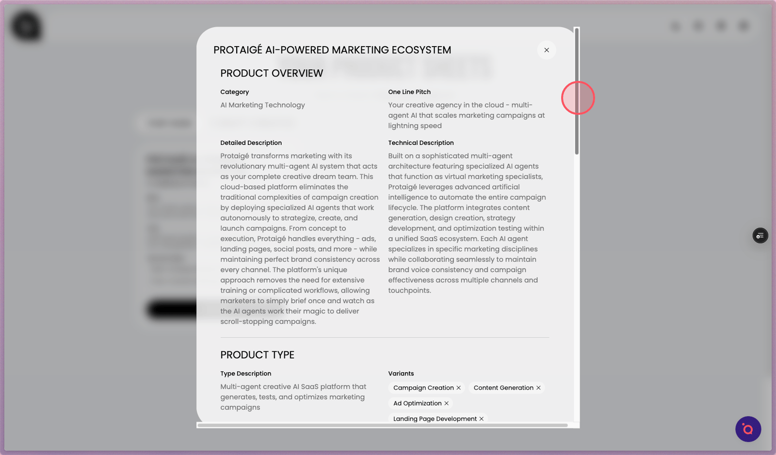 3. Scroll within the product details modal to review all sections and specifications.