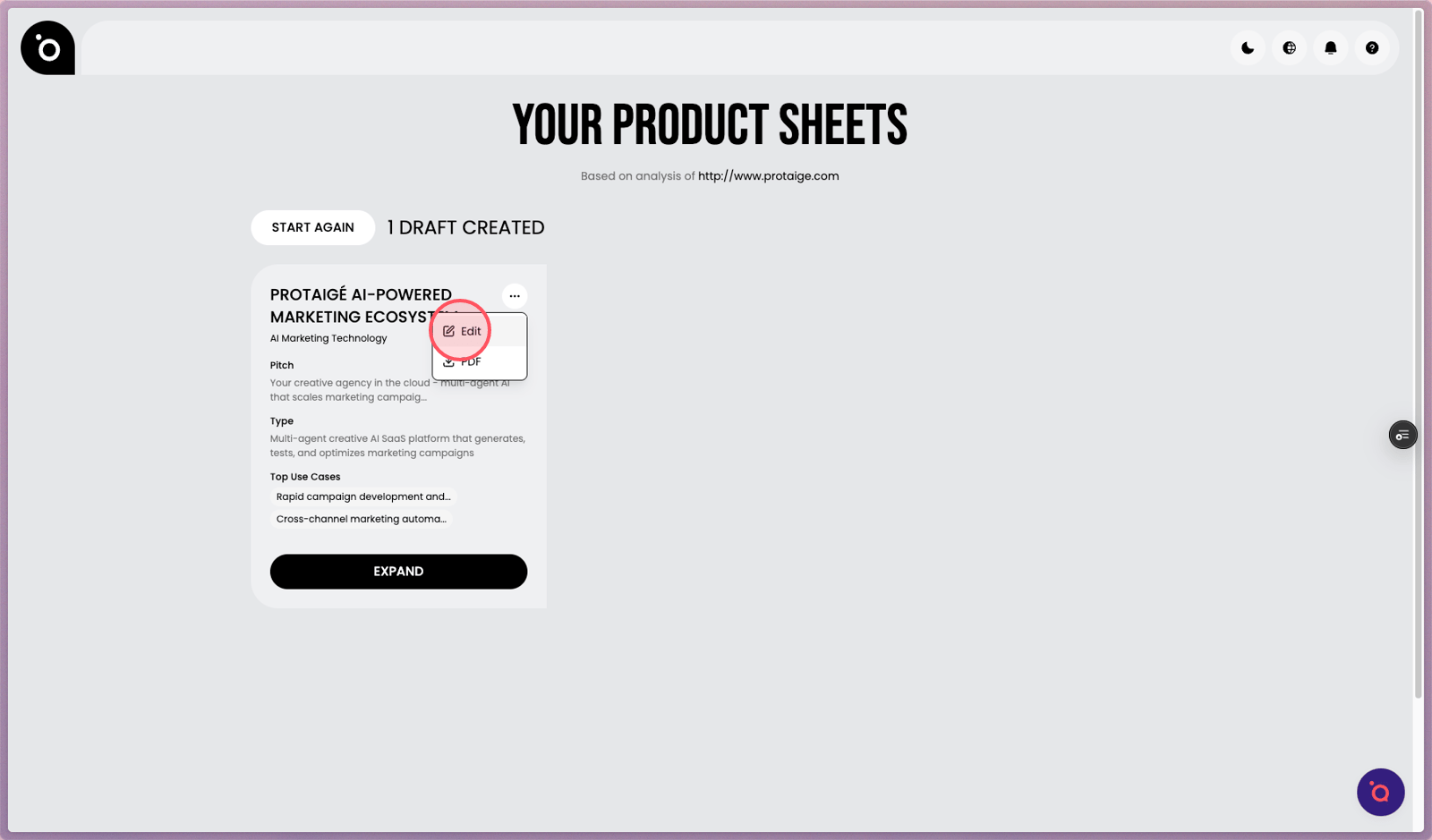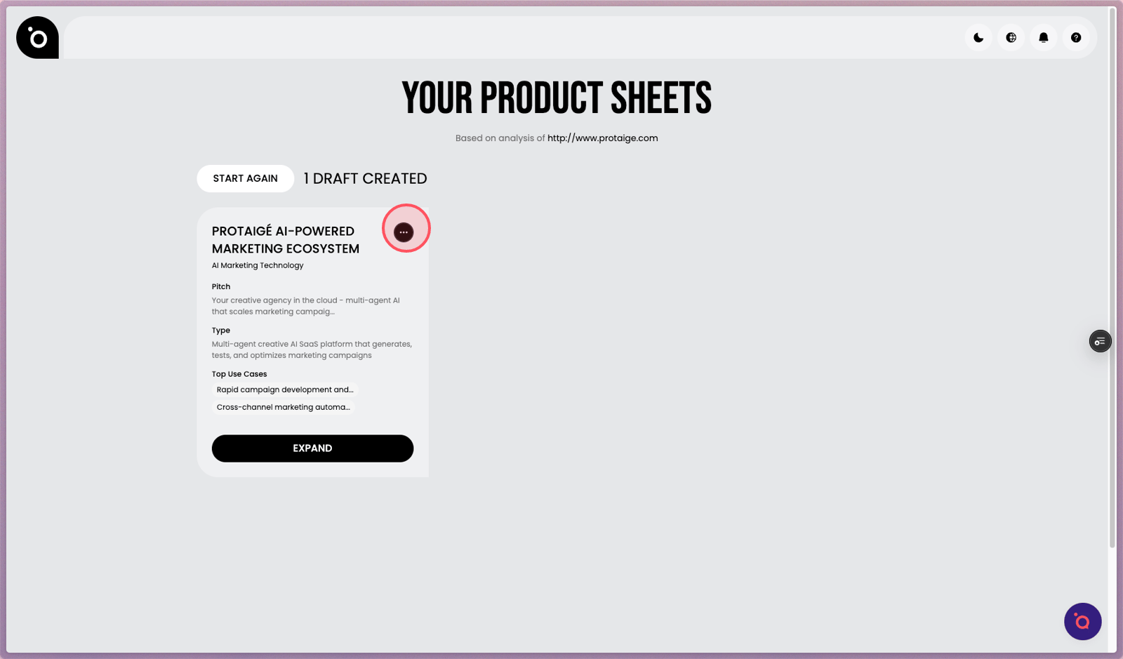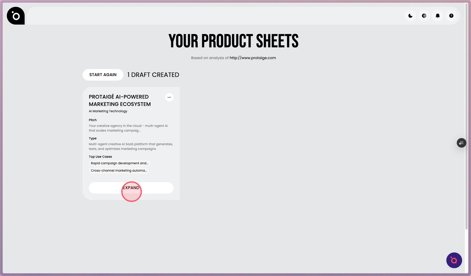 2. After a few minutes, your product sheets will appear in this view. Expand the generated to view its details.